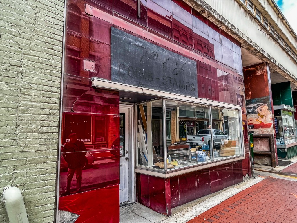 During one of my recent visits to Cumberland for a community meeting, a historian with the National Park Service mentioned to me that Lapidus designed at least two storefronts in downtown Cumberland. One was one I happened to walk by during one of my earlier visits to photo-document the town. There was something special about this storefront given its glass display boxes and the porcelain enamel panels adorning the building’s first-floor walls. The storefront, located at the corner of Liberty and Baltimore Streets in the former Manhattan Building, was in decent shape despite the years since its installation and the wear and tear of the businesses that rented the space over the decades. It looked highly intact and quite amazing – a compelling clue of a past that was not that long ago.