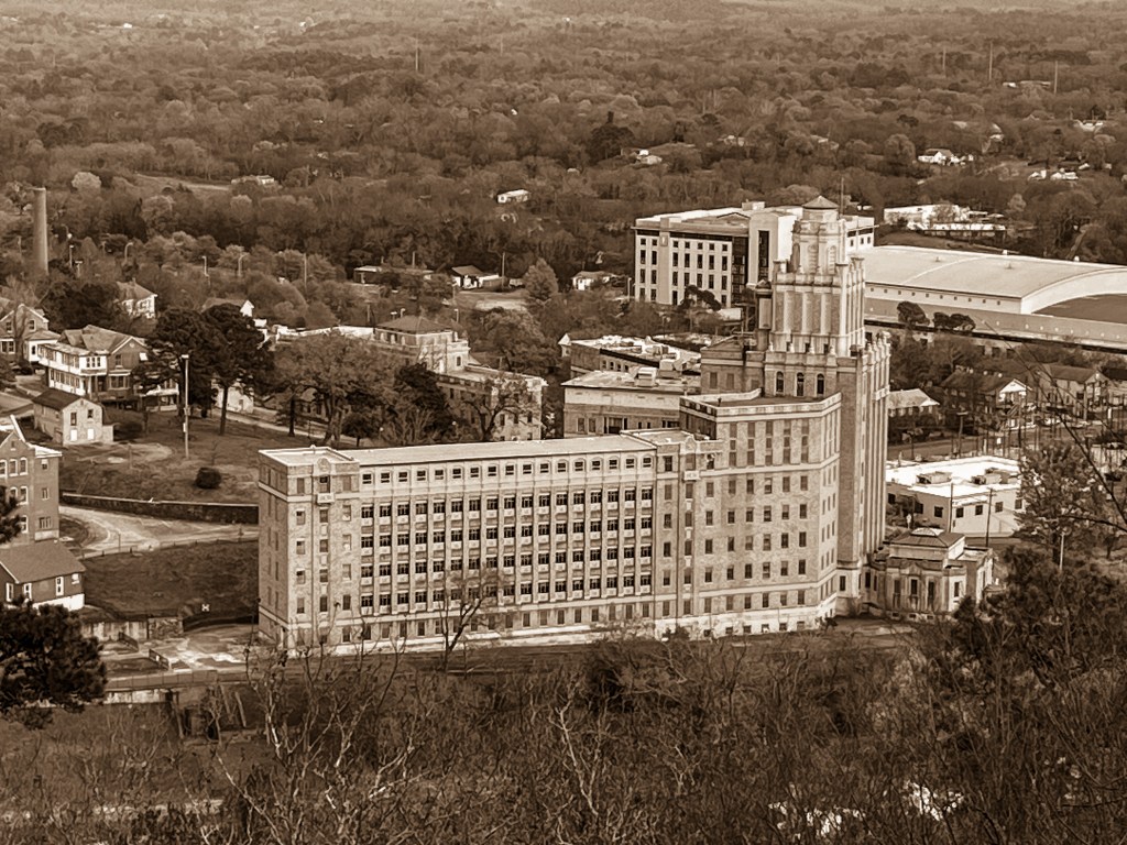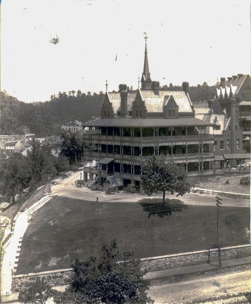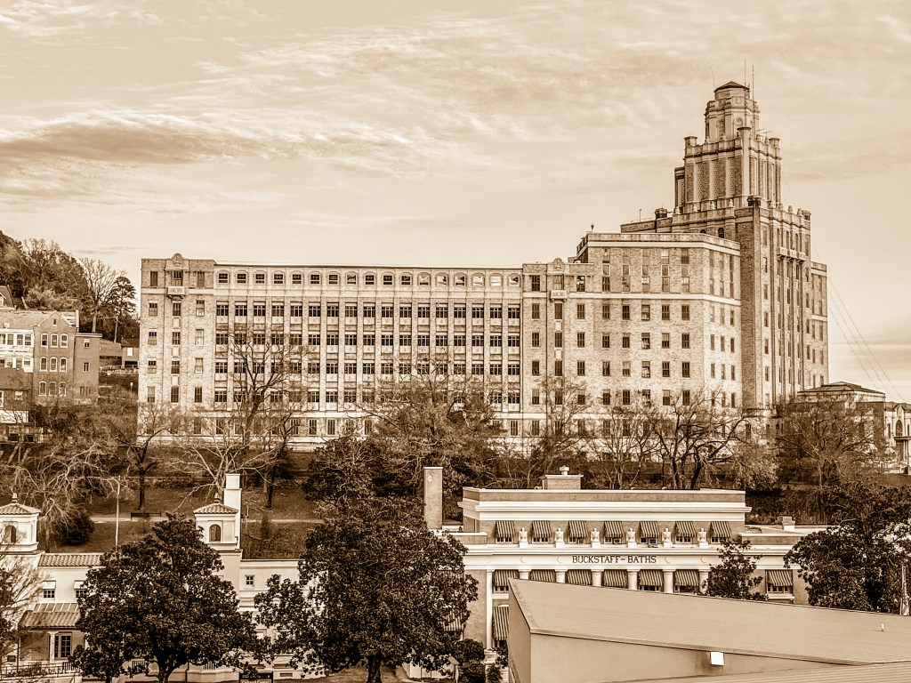 The Army and Navy General Hospital over Bathhouse Row. The Buckstaff Bathhouse to the lower right.